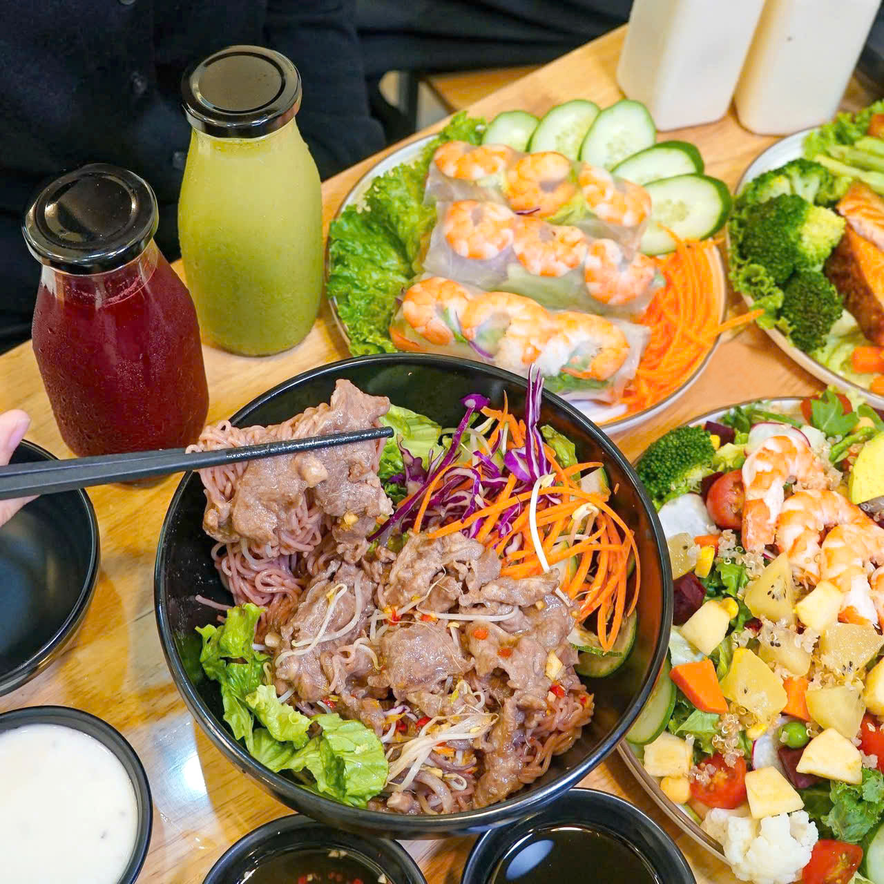 Các món ăn tại An Nhiên chú trọng cân bằng dinh dưỡng và giữ trọn hương vị tự nhiên. Nguyên liệu tươi sạch như gạo lứt, cá hồi, ức gà, bò áp chảo được chọn lọc kỹ mỗi ngày, kết hợp rau củ giòn ngọt, bắt mắt. Phần ăn được chia khẩu phần hợp lý, giúp no lâu mà vẫn nhẹ nhàng. Đặc biệt, các loại nước ép và detox được pha chế từ rau củ quả tự nhiên, không thêm đường, không mật ong, mang đến vị thanh mát thuần khiết, hỗ trợ thanh lọc cơ thể. Thực đơn đa dạng, phù hợp dùng tại chỗ hay mang đi, luôn đảm bảo chất lượng và sự tinh tế.