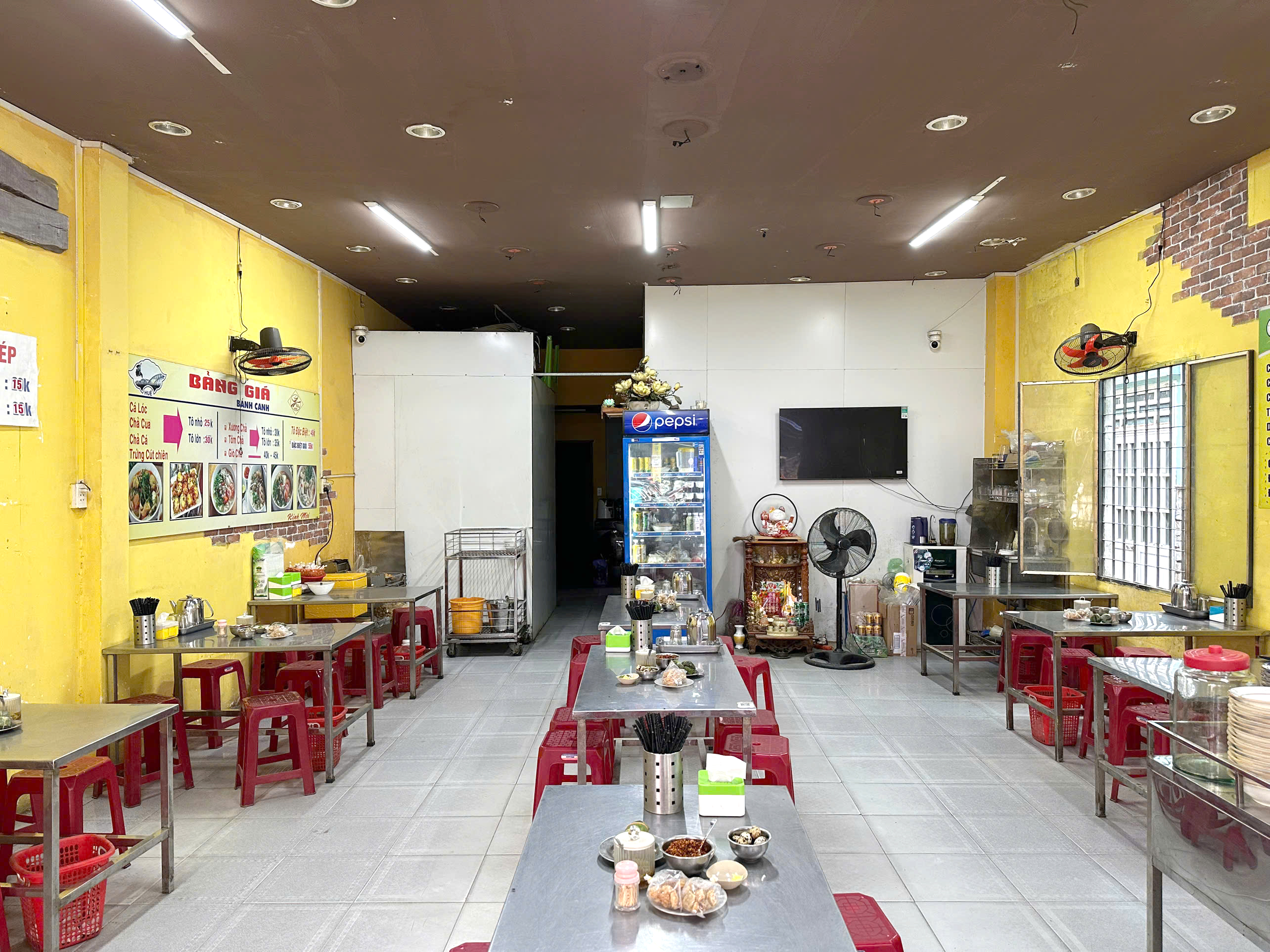 Không gian Bánh Canh Cá Lóc Bé Hiền mang nét mộc mạc, gần gũi đúng kiểu quán ăn bình dân của người Đà Nẵng. Tông vàng ấm áp cùng bàn ghế inox và ghế nhựa đỏ tạo cảm giác thân quen, giản dị. Quán sạch sẽ, sắp xếp gọn gàng, dễ chọn chỗ ngồi. Bảng menu treo tường rõ ràng, hình ảnh món ăn hấp dẫn khiến ai nhìn cũng muốn thưởng thức ngay. Dưới ánh đèn vàng, không khí luôn rộn ràng nhưng vẫn giữ được sự thân tình, ấm cúng.