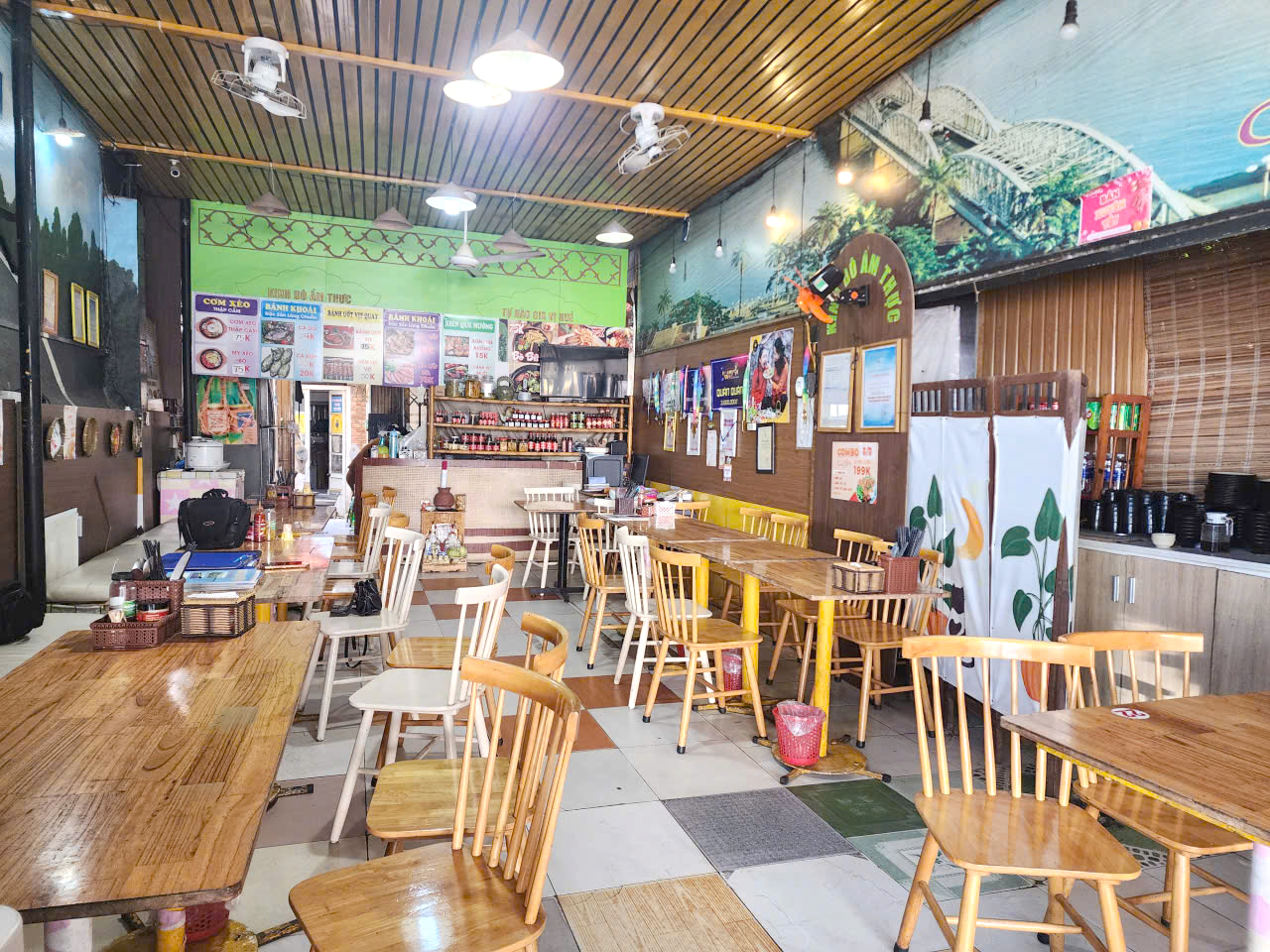 Không gian của Bánh Khoái Cá Kình – Quang mang đậm hơi thở dân dã, gợi nhớ về những phiên chợ quê xưa. Gian bếp nhỏ bên hiên với mái lá mộc mạc, nơi khói bếp tỏa hương bánh nóng khiến ai đi ngang cũng phải dừng chân. Bên trong quán là không gian ấm cúng, gọn gàng với bàn ghế gỗ sáng màu tạo cảm giác thân thiện và gần gũi. Những hình ảnh về Huế và món quê được bài trí khéo léo, gợi nét hoài niệm mà vẫn tươi mới. Tất cả hòa quyện tạo nên một nơi vừa giản dị, vừa mang đậm hồn quê xứ Huế.