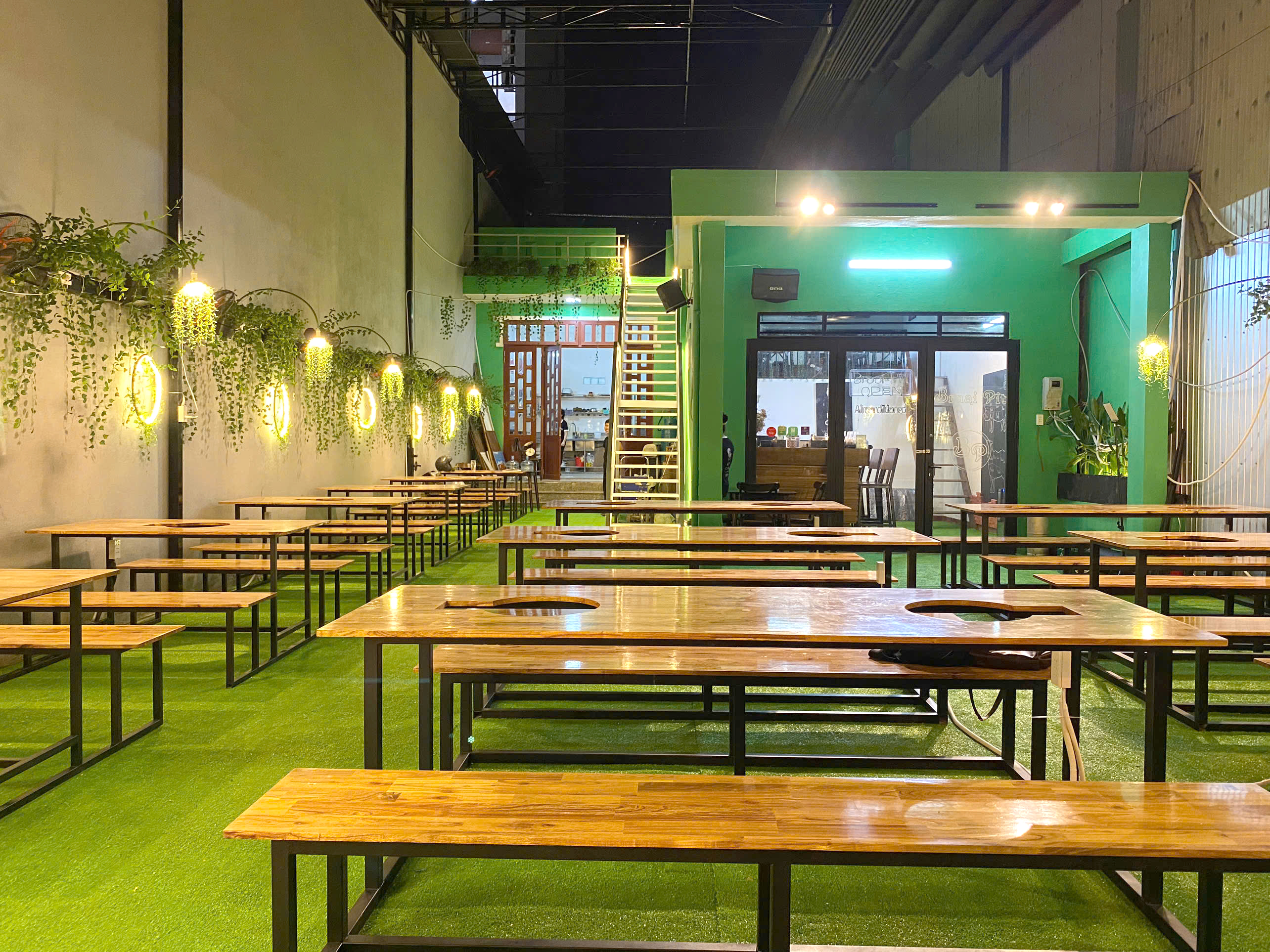 Không gian Braai Pit được thiết kế mở, thoáng mát với phong cách mộc mạc và gần gũi. Tầng trệt là khu vực chính với bàn gỗ dài, ánh đèn vàng ấm và cây xanh điểm xuyết khắp nơi, mang đến cảm giác tự nhiên và thoải mái. Tầng trên là không gian riêng tư hơn, thích hợp cho buổi gặp gỡ nhỏ hay tiệc gia đình, vừa ấm cúng vừa hiện đại. Điểm nhấn của quán là khu bếp nướng đặt ngay trong khu vực ăn uống – nơi thực khách có thể nhìn ngắm đầu bếp chế biến, cảm nhận trọn vẹn không khí tiệc nướng đúng điệu.