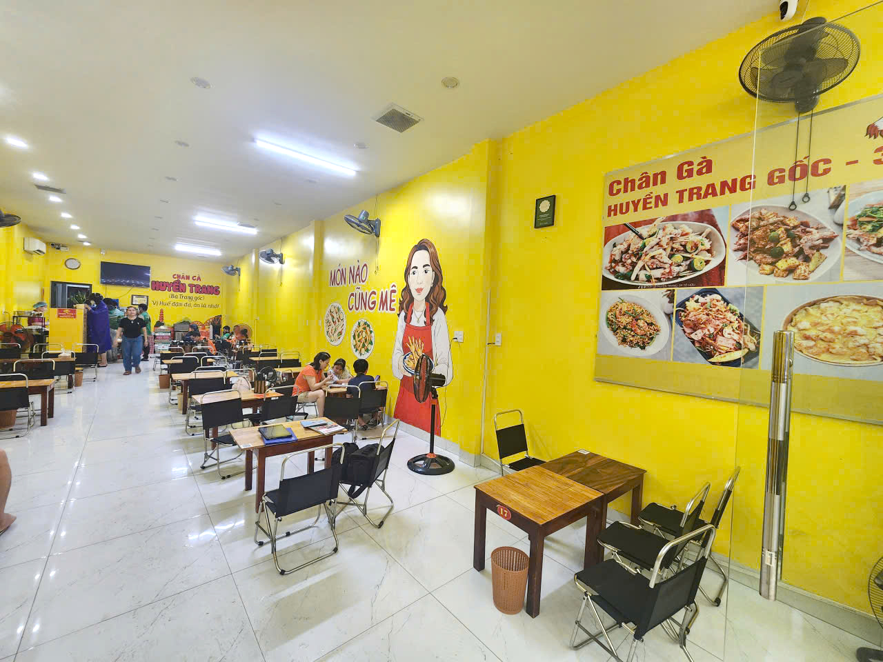 Toạ lạc tại 151 Bà Triệu, Xuân Phú, Huế. Không gian ở đây mang sắc vàng nổi bật, tạo cảm giác tươi sáng và gần gũi ngay từ khi bước vào. Quán được thiết kế rộng rãi, thoáng đãng với sàn gạch trắng sạch sẽ, khiến thực khách luôn cảm thấy dễ chịu. Những bức tường trang trí bằng hình ảnh món ăn sinh động và slogan “Món nào cũng mê” tạo nên điểm nhấn vui mắt, gợi sự thèm ăn. Hệ thống bàn ghế gọn gàng, đơn giản nhưng ấm cúng, phù hợp cho cả nhóm bạn lẫn gia đình. Từ ngoài cửa kính trong suốt, khách có thể nhìn thấy không khí nhộn nhịp bên trong quán. Quạt treo tường và ánh sáng trắng được bố trí hợp lý, giúp không gian luôn sáng sủa, mát mẻ. Bên cạnh đó, thực đơn phong phú được treo trực diện, thuận tiện cho khách dễ dàng lựa chọn món. Tất cả hòa quyện, tạo nên một địa chỉ ẩm thực không chỉ ngon miệng mà còn thoải mái, thân thiện cho mọi thực khách.