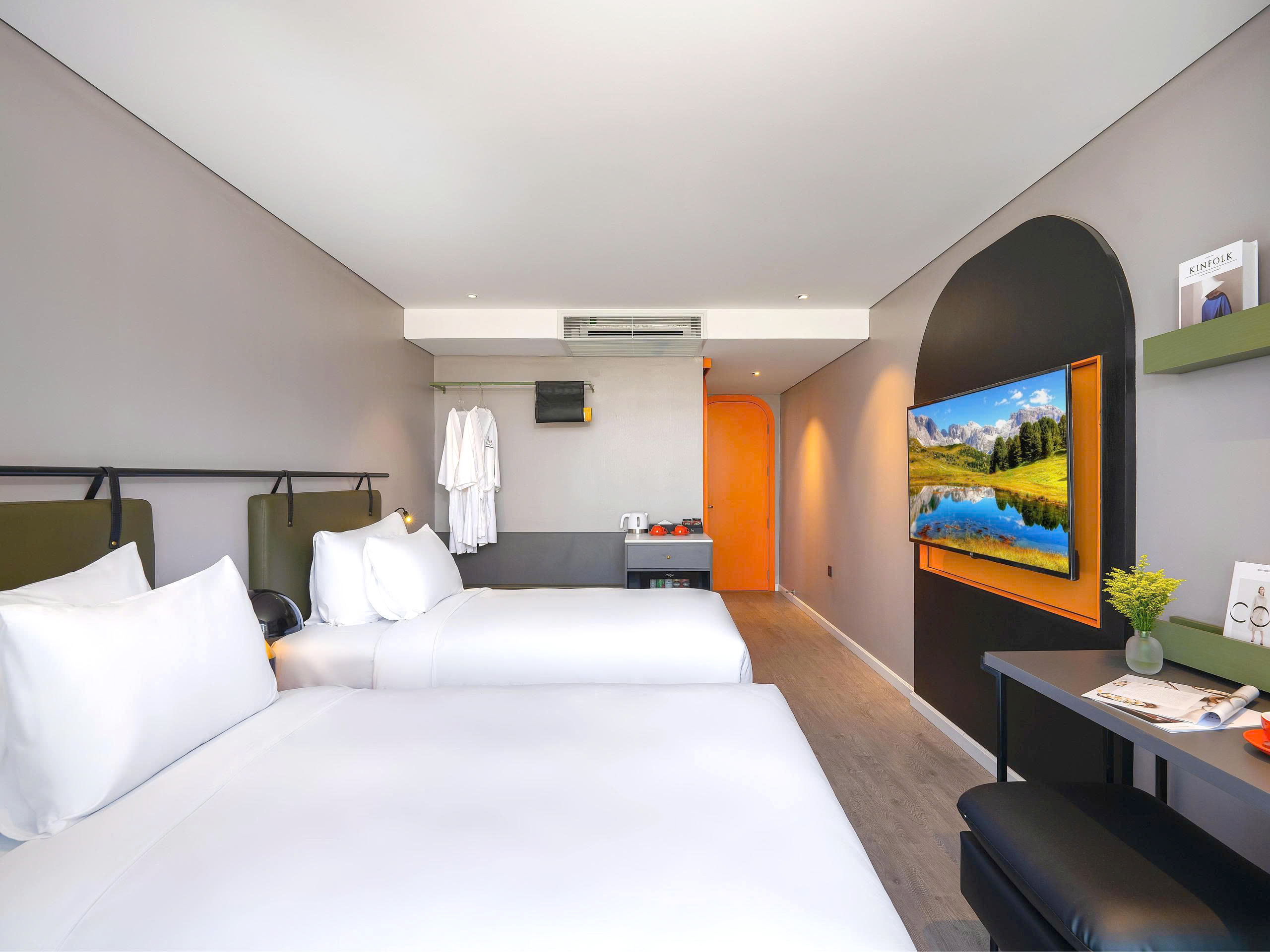 Không gian phòng nghỉ được thiết kế thoáng đãng với tông màu ấm áp, cửa kính lớn đón ánh sáng tự nhiên. Các hạng phòng giường đơn và giường đôi đều rộng rãi, trang bị đầy đủ tiện nghi giúp khách nghỉ ngơi thoải mái. Sảnh lễ tân mang phong cách hiện đại, tạo ấn tượng ngay từ khoảnh khắc đầu tiên. Hồ bơi vô cực trên cao sở hữu tầm nhìn rộng mở, là nơi lý tưởng để thư giãn giữa không khí trong lành của thành phố biển.
