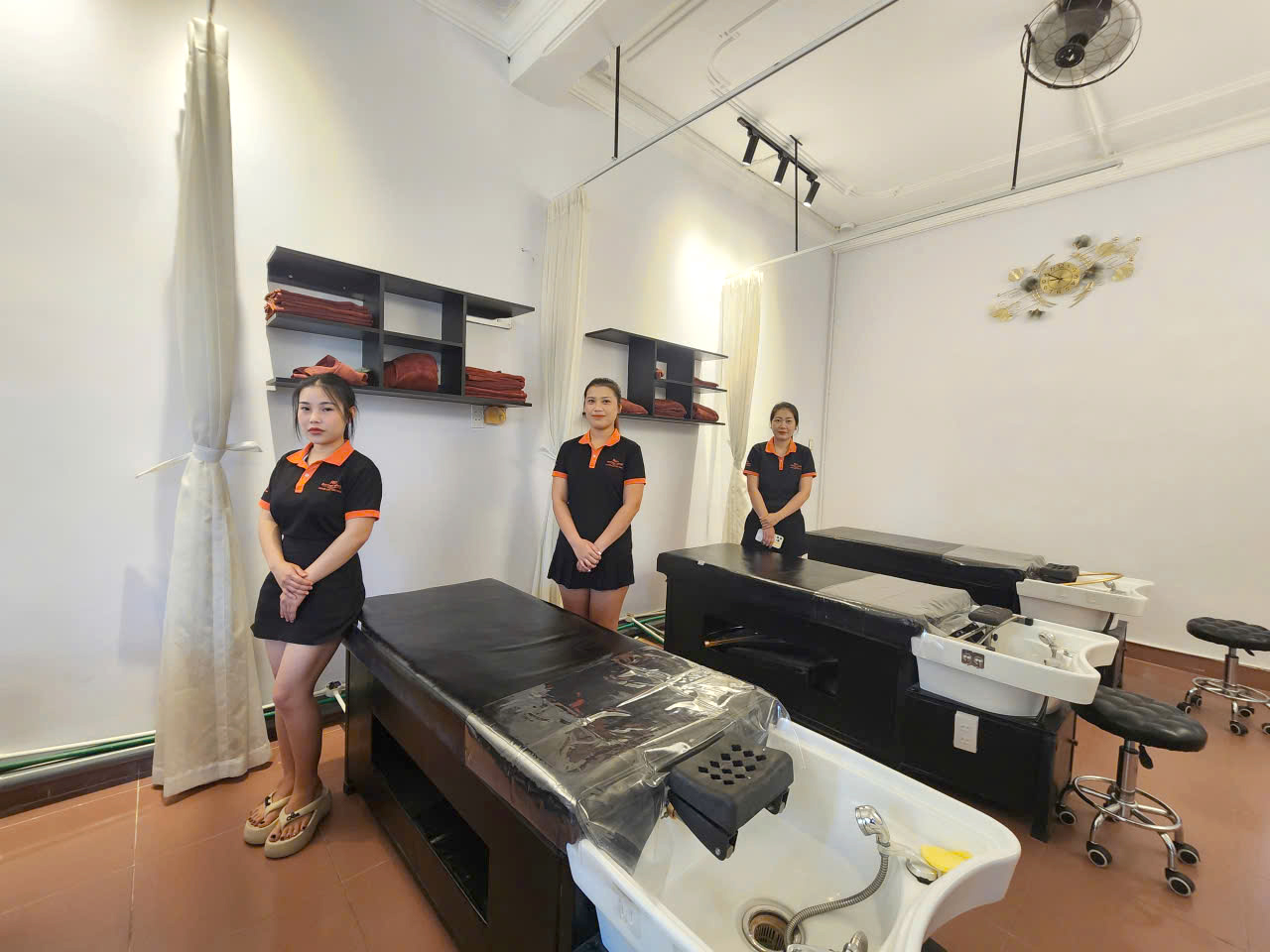 Không gian tại Rin Barber Shop được bố trí chuyên nghiệp với hai tầng riêng biệt, tạo nên trải nghiệm trọn vẹn cho khách hàng. Tầng 1 là khu cắt tóc và lấy ráy tai, được thiết kế hiện đại với hàng ghế cắt thẳng hàng, gương lớn sáng bóng cùng ánh sáng trắng dịu, giúp khách vừa thoải mái vừa yên tâm khi chăm sóc diện mạo. Bước lên tầng 2, khách sẽ được tận hưởng không gian thư giãn dành riêng cho dịch vụ gội đầu và chăm sóc da đầu. Các giường nằm được sắp xếp ngăn nắp, có rèm ngăn tạo sự riêng tư, cùng hệ thống thiết bị chăm sóc da, massage đặt gọn gàng hai bên. Sự kết hợp giữa tiện nghi hiện đại và phong cách phục vụ chuyên nghiệp mang lại cảm giác vừa thư thái vừa tin tưởng. Đây chính là nơi khách hàng không chỉ làm đẹp mà còn được trải nghiệm sự chăm sóc toàn diện từ đầu đến chân.