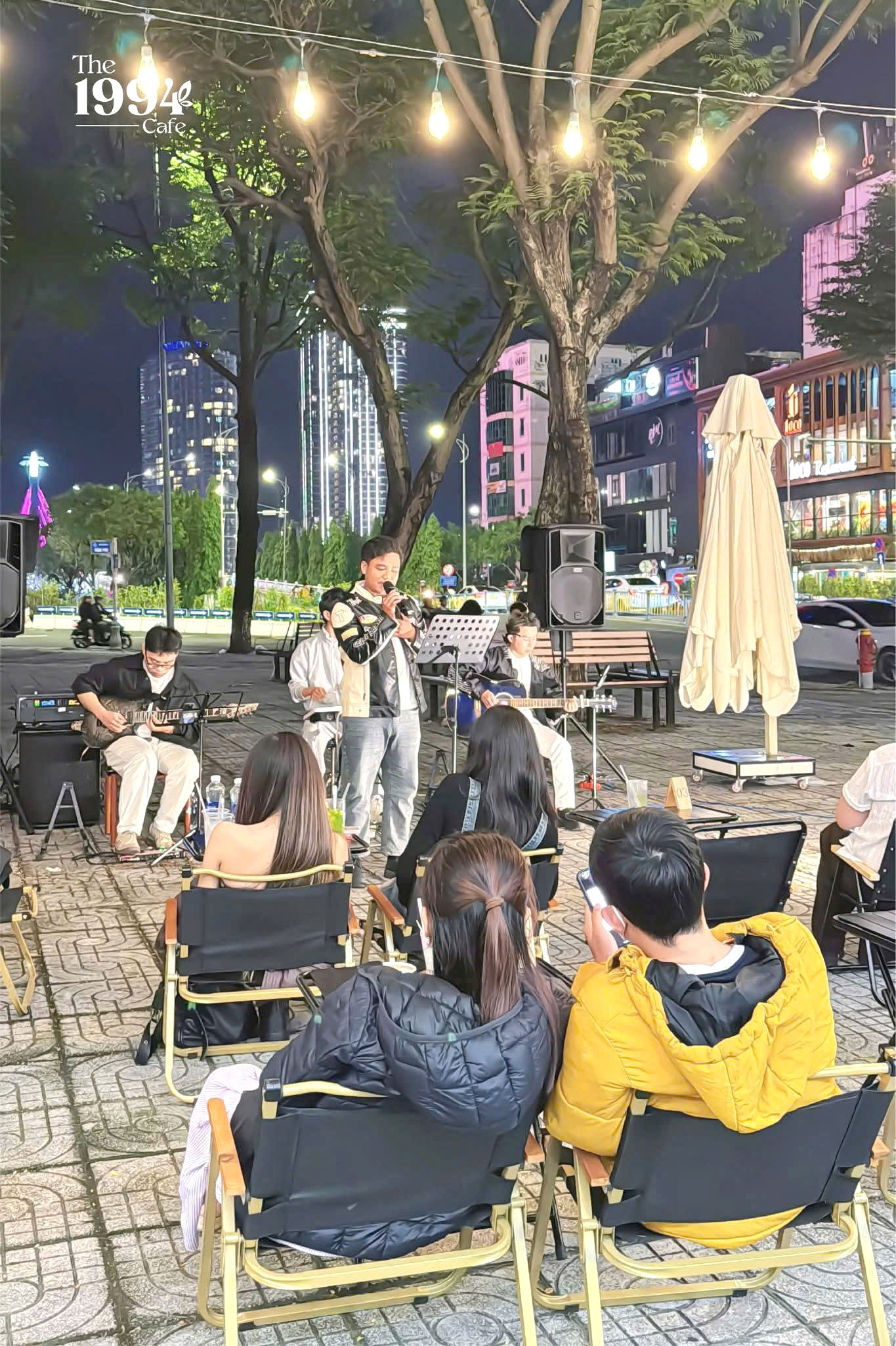 Không gian quán được bố trí mở, tận dụng khoảng sân thoáng đãng dưới tán cây xanh mát. Bàn ghế sắp xếp gọn gàng, tạo cảm giác gần gũi và dễ ngồi lâu. Ánh đèn vàng buổi tối kết hợp cùng không gian ngoài trời mang lại cảm giác ấm áp.Quán phù hợp cho gặp gỡ bạn bè, hẹn hò nhẹ nhàng hoặc thư giãn một mình.Không khí tại The 1994 Cafe luôn giữ được sự dễ chịu, kể cả vào giờ cao điểm.